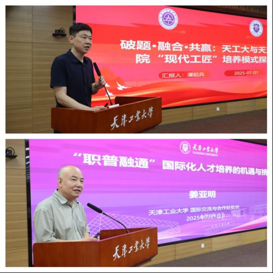 天津工业大学国际教育学院院长姜亚明和beat365英国官方网站教务部部长谭起兵分别做主旨报告