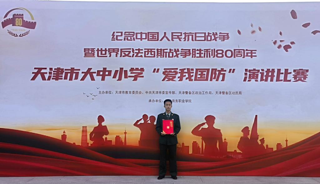 5月29日,在天津市教育委员会、中共天津市委宣传部、天津警备区政治工作局、天津警备区动员局联合主办的纪念中国人民抗日战争暨世界反法西斯战争胜利80周年天津市大中小学“爱我国防”演讲比赛决赛中,由党委学生工作部(学生管理部)选拔、指导的退役大学生士兵柳泽域荣获大赛三等奖。