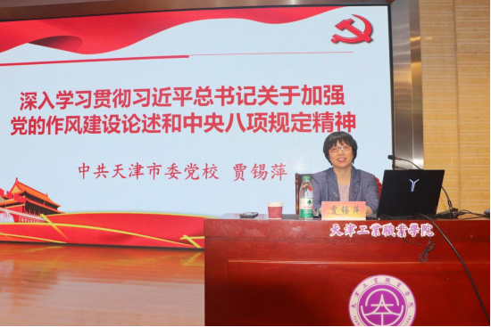 为更好推动学院深入贯彻中央八项规定精神学习教育走深走实,强化对《习近平关于加强党的作风建设论述摘编》内容的理解认识,提升学习教育效果,4月15日,学院党委邀请中共天津市委党校贾锡萍教授到校进行专题讲座。学院领导班子成员、全体党员、全体中层干部现场聆听讲座。