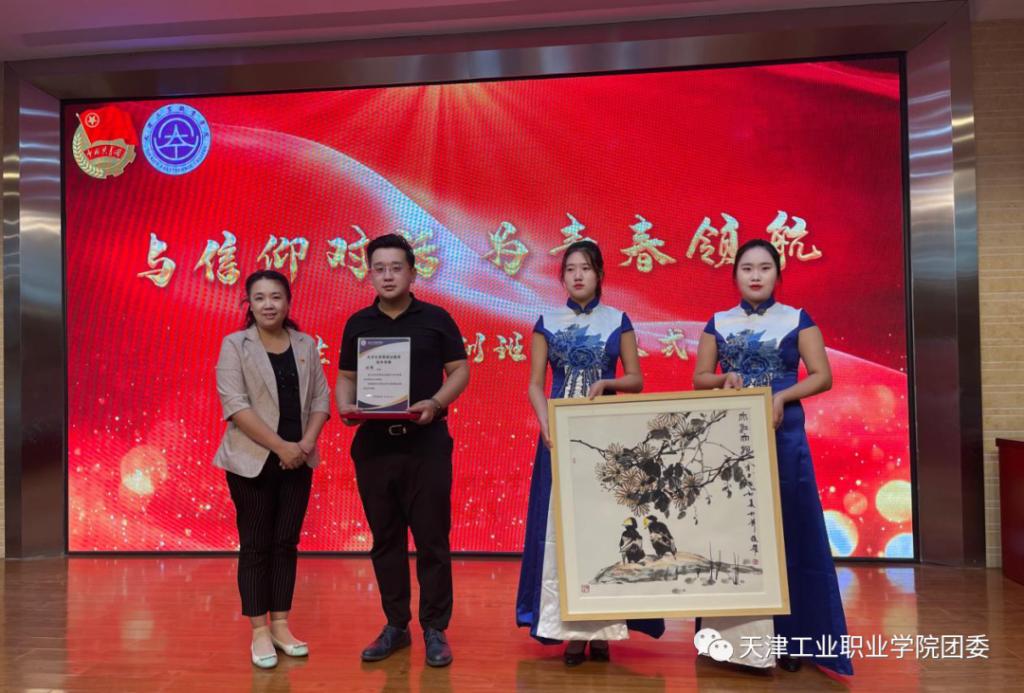 学院党委书记汪坪为张耀老师颁发校外思政导师聘书,张耀老师为学院赠送画作。