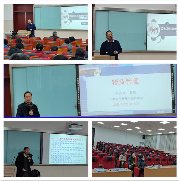 本次培训特邀天津大学牛占文、潘海生、祝士明三位教授,分别从精益管理方法体系及实践、精益管理运营原则及案例分析、迈向高技能社会的中国职业技术教育的发展战略分析、“三教”改革背景下高职院校教育教学改革与发展等方面进行专题讲座。培训深刻阐述了精益化管理是一种经营哲学,是提升学院管理水平,促进学院管理提质增效的有效举措,其核心是把精益管理思想运用到学院职业教育和管理的全过程。当前世界正经历百年未有之大变局,我国已经进入高质量发展阶段,而职业教育是构建高质量发展的重要支撑。职业教育要坚持以人为核心,实现职业生涯发展的教育。强调技术创新是职业教育标准化的内在逻辑,高职要结合“三教”改革,提升教师教学组织实施能力;促进产教融合,打造命运共同体,整体提升职教治理水平。