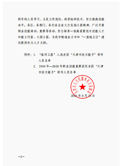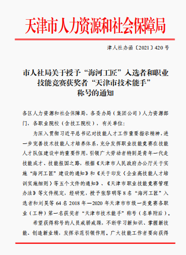 近日,天津市人社局授予2018年-2020年天津市市级一类竞赛各职业(工种)第一名获奖者“天津市技术能手”称号。beat365机械工程系谢金涛、李连亮、戴冬晨三名老师以2019年天津市智能制造应用技术技能大赛暨第三届全国智能制造应用技术技能大赛天津选拔赛第一名的成绩获此称号。