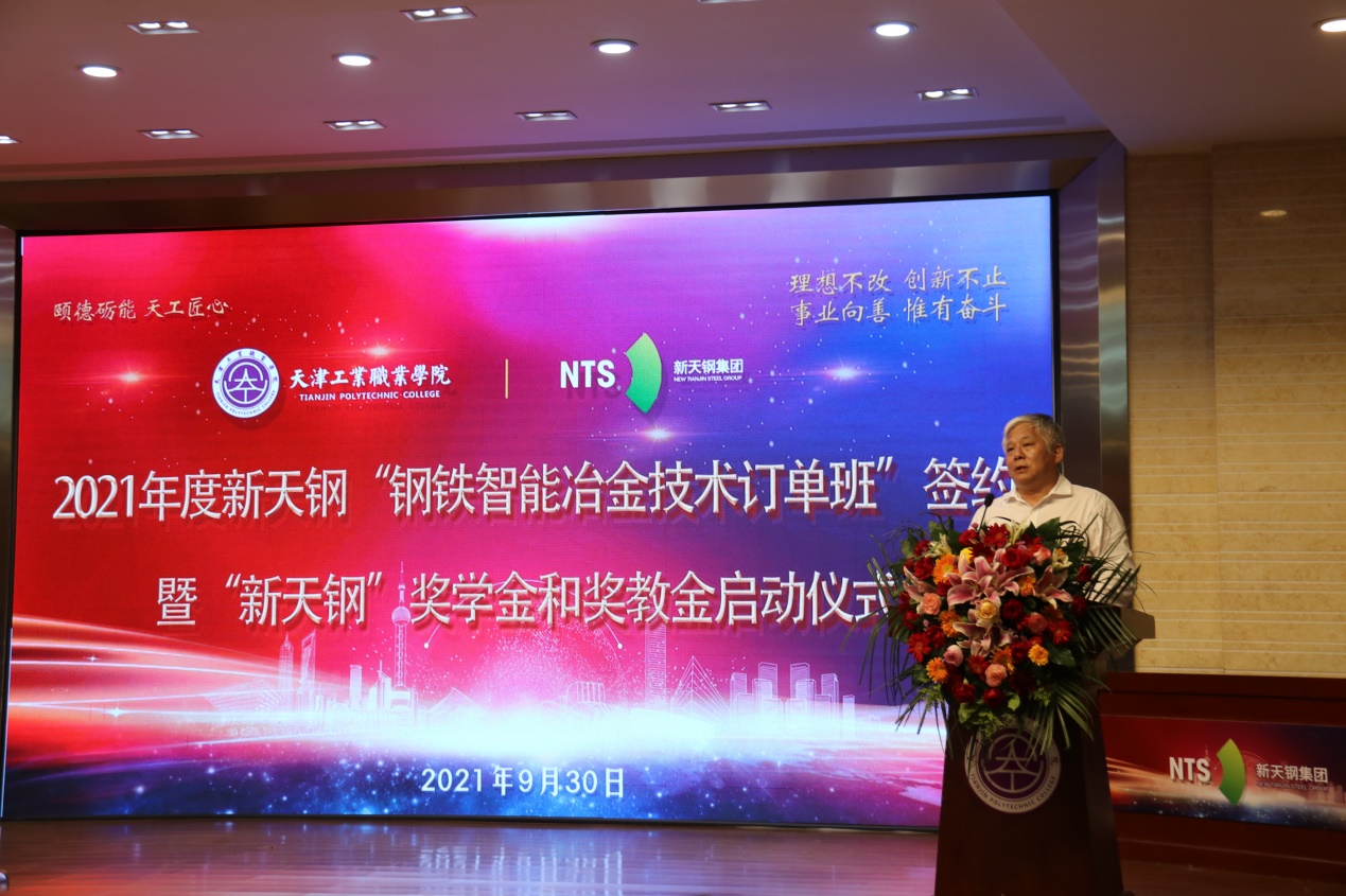 新天钢集团执行总裁阚永海介绍了新天钢集团的基本情况和混改后的发展情况,并表示集团大力支持学院教育事业发展,强化企业与学院在行业高素质技术技能人才培养、储备等方面的合作交流。在学院专门设立“新天钢”奖学金、奖教金和学子奖学金(为订单班特设)等,用于奖励品学兼优的学生以及在教育教学、人才培养、成果培育、就业推介等工作中表现突出、取得特殊成绩和贡献的优秀教育工作者。