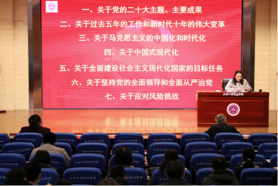 2022年11月25日下午,为深入学习宣传贯彻党的二十大精神,切实把学院广大党员干部和师生员工的思想和行动统一到党的二十大精神上来,学院党委书记汪坪为学院全体党员作党的二十大精神宣讲报告。报告会在学院六角报告厅举行,学院领导班子成员和全体党员参加。